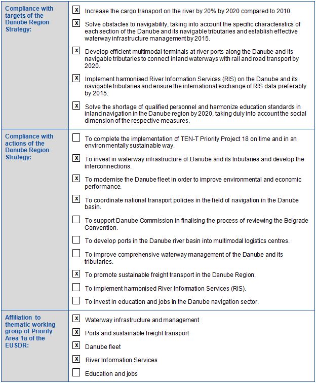 The project functioned as a network of stakeholders supported by the EUSDR/PA1A and all relevant national stakeholders from the public and private sector in providing better framework conditions for inland waterway transport as the most environmentally friendly mode of transport in accordance with the Priority Area 1A objectives.