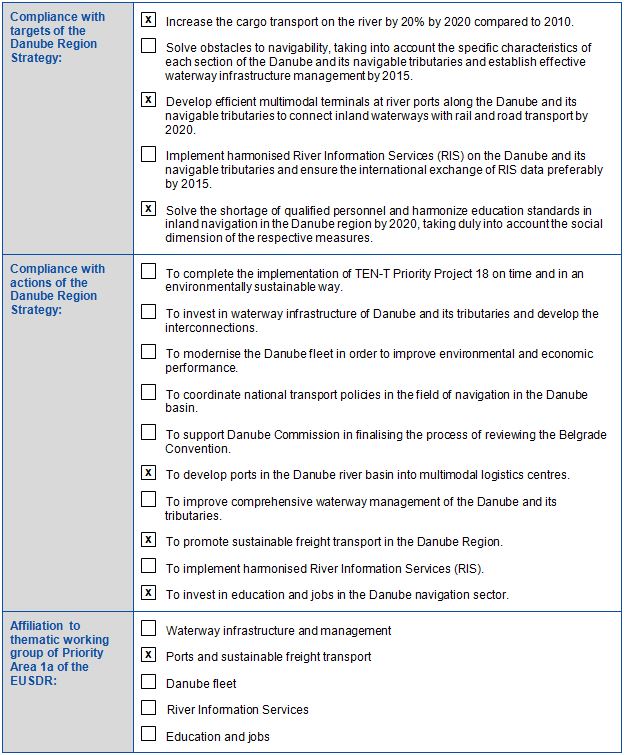 In order to ensure a balanced development of the transport network in the Danube region and to secure a better connectivity and interoperability between Danube Ports there needs to be a project platform allowing the elaboration of a transnational strategy for Danube ports and targeted actions to improve the functioning of Danube ports. These actions target port legislation, port administration/ management and port development as fundamental elements for further developing ports into multimodal hubs, high-performing terminals providing reliable transport links and economic growth and job opportunities.