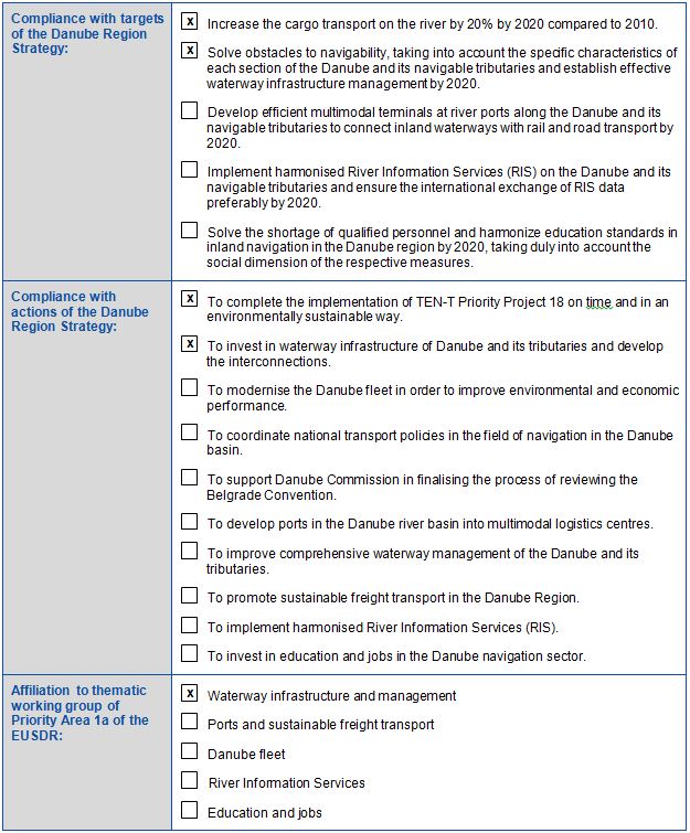This project on the common Romanian-Bulgarian sector has a special importance in terms of ensuring navigation conditions on the Danube. It was selected as a priority project under Axis 18 for the Rhine/Meuse–Main–Danube transport axis, according to Decision 884/2004/EC of the European Parliament and the Council as well as on the Rhin – Danube Core Network Corridor.