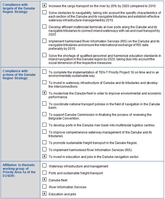 - Development of navigation on the Danube by limiting the negative impact of transport systems on the Danube ecosystem by elaborating a transnational strategy for an adequate management. This should ultimately lead to the limitation of pollutant emissions in the Danube corridor.