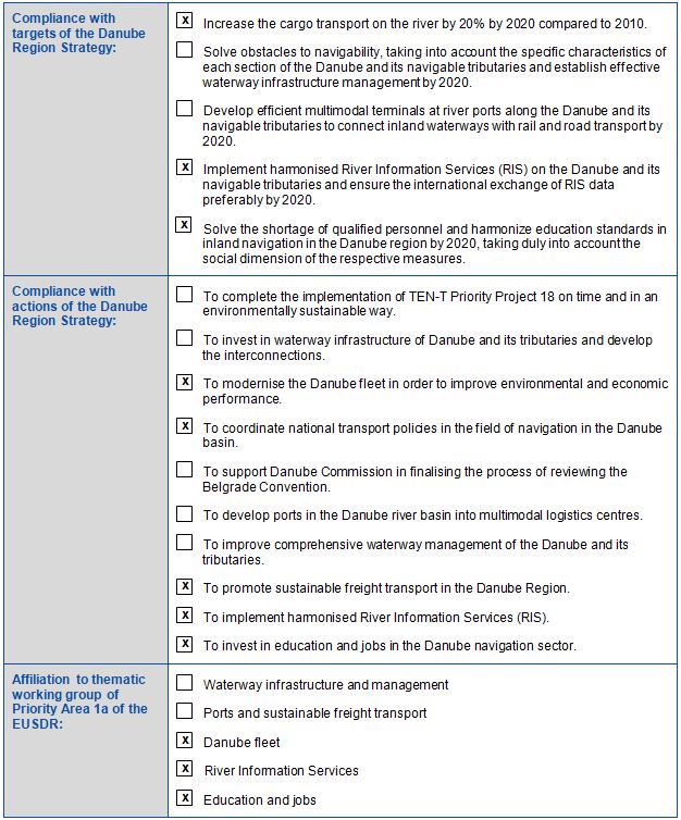 - Know-how transfer for Danube fleet modernisation strategy and actions – The existing knowledge gap, the shortfall of activities and lack of instruments should be overcome with the help of intensive transnational collaboration between private & public stakeholders and targeted know-how transfer activities. These activities were designed to bridge the gaps between Western Europe and the Danube region and would support harmonised strategies & tools to stimulate investments into advanced Danube fleet.