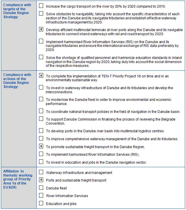 Deployment of a fixed LNG refueling station at this tri-modal core port. This station would serve not only LNG-propelled vessels but also LNG trucks and later possibly trains as well. In addition, the project foresees to retrofit existing vessels with LNG propulsion. The project will study the design of the innovative LNG related infrastructure, implement it and will disseminate appropriate related results.